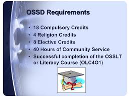 Student are expected to earn a total of 16 credits in Grade 9-10, 14 Credits in Grade 11-12, Min. of 75% achievement in Literacy test and up to 40 hours of Community service to be awarded the certificate.